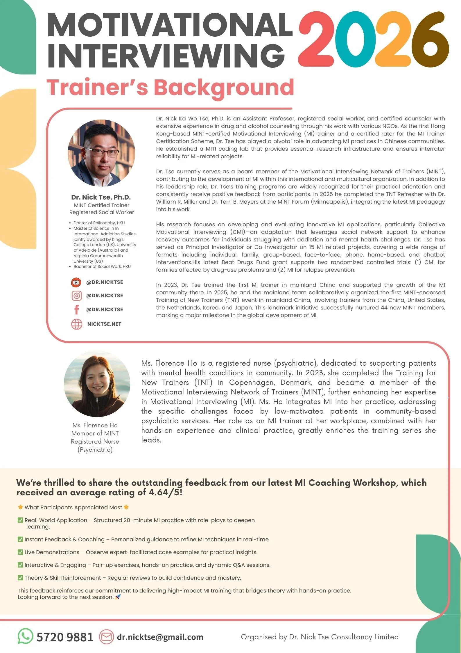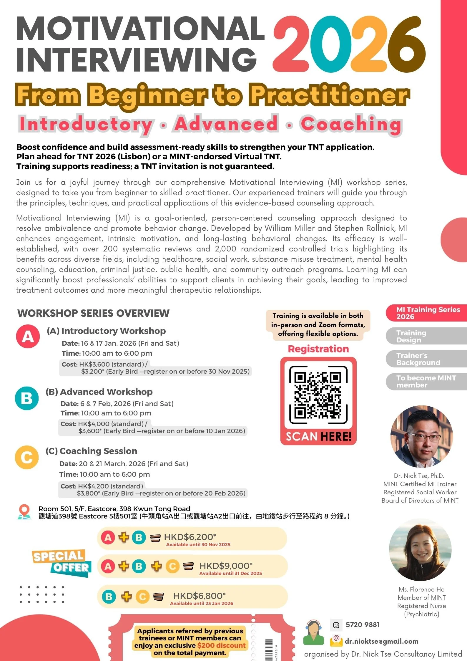 This is Nick, a MINTie from Hong Kong, China. In the past few years, I co-developed with Professor Samson Tse, collective motivational interviewing (CMI). You are invited to participate in the briefing session on the collective MI to grasp its latest development and application. The briefing session lasts for 1-1.5 hours to provide a platform for creating dialogue and exchanging ideas on CMI.